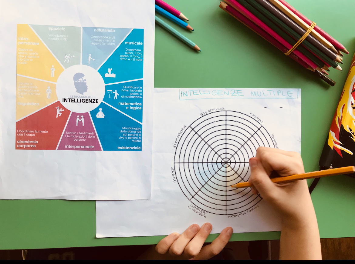 Un grosso lavoro è stato fatto anche rispetto al tema delle intelligenze multiple (Gardner, 1983) esplorando le diverse percezione del/la singolo/a allievo/a relativamente al proprio livello di intelligenza linguistica, logico-matematica, spaziale, naturalistica, interpersonale, intrapersonale, corporeo-cinestetica, esistenziale e musicale. Questo affondo ha permesso, a latere, di toccare i temi della motivazione e della fiducia in se stessi. Molti alunni/e infatti, durante i colloqui, hanno espresso il fatto di non sentirsi intelligenti dato lo scarso rendimento scolastico. Le schede proposte, le attività educative e artistiche hanno fatto emergere le capacità e risorse presenti in ognuno/a riuscendo così a far aumentare il senso di consapevolezza e orientamento nella relazione con se stessi e nei confronti dei propri obiettivi futuri.